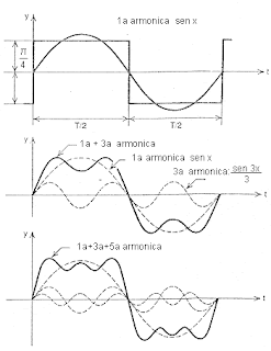 Lo strumento ha degli oscillatori, cioè dei circuiti che producono frequenze e la più semplice di esse è la sinusoide, che poi è il suono prodotto da un diapason. Fourier scoprì che se sommo in modo opportuno tali sinusoidi, posso "sintetizzare" qualunque forma d'onda corrispondente a qualsiasi strumento musicale. Io mi sono divertito a sintetizzare qualcosa di molto simile all'onda quadra, sommando alla frequenza fondamentale le sue armoniche dispari, cioè oscillazioni via via 3,5,7,9, ecc più alte ma con 3,5,7,9 ecc. ampiezze più basse. Il perchè di questo costituisce la teoria delle trasformate di Fourier. nella figura in alto in blu è la fondamentale le onde più piccole le armoniche, ne rappresento solo tre, mentre in viola è la somma delle 3,5,7,9,11,13, quindi 5 armoniche. Già con 10 di esse si ha un qualcosa di molto simile all'onda quadra.Se volete, ho il file excel.